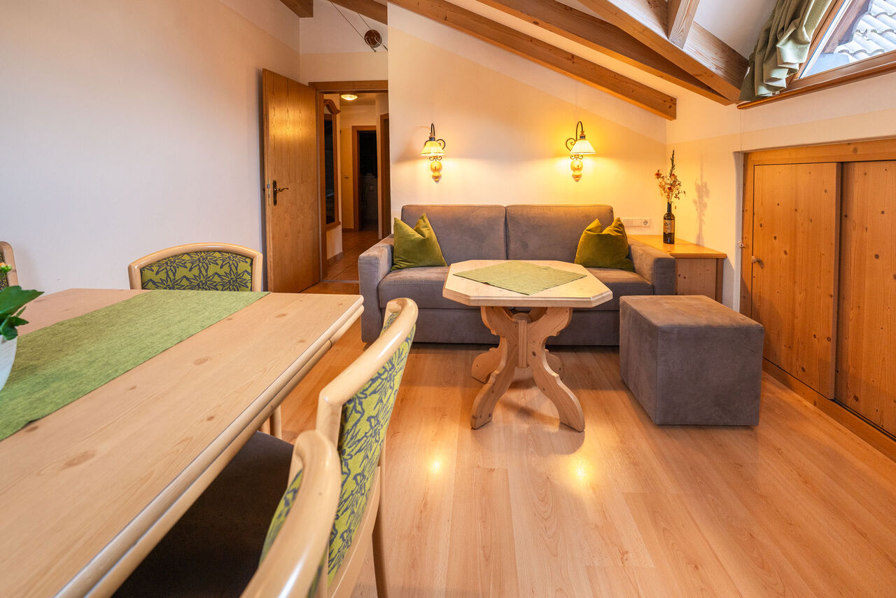 L’Appartamento 05 è uno dei due appartamenti mansardati, con timpano e soffitto spiovente che contribuiscono a un’atmosfera calda e accogliente.